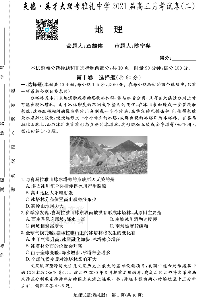 【地理】炎德英才大聯(lián)考2021屆雅禮中學(xué)高三2次月考