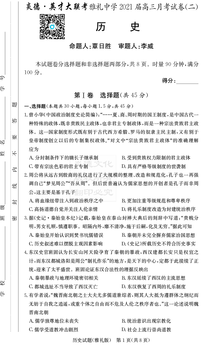【歷史】炎德英才大聯(lián)考2021屆雅禮中學(xué)高三2次月考