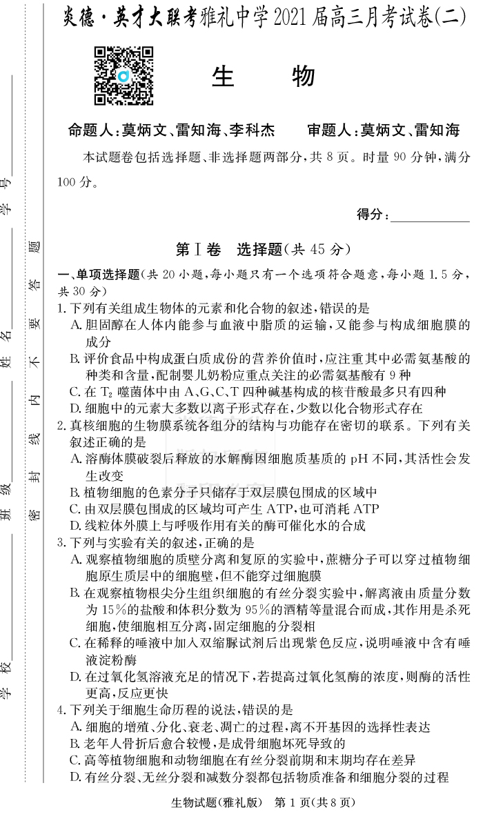 【生物】炎德英才大聯(lián)考2021屆雅禮中學(xué)高三2次月考