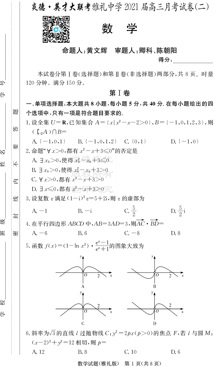 【數(shù)學】炎德英才大聯(lián)考2021屆雅禮中學高三2次月考