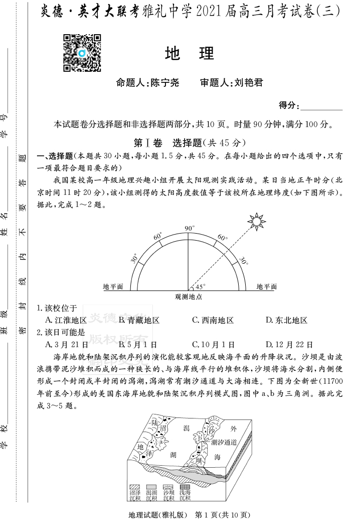 【地理】炎德英才大聯(lián)考2021屆雅禮中學高三3次月考