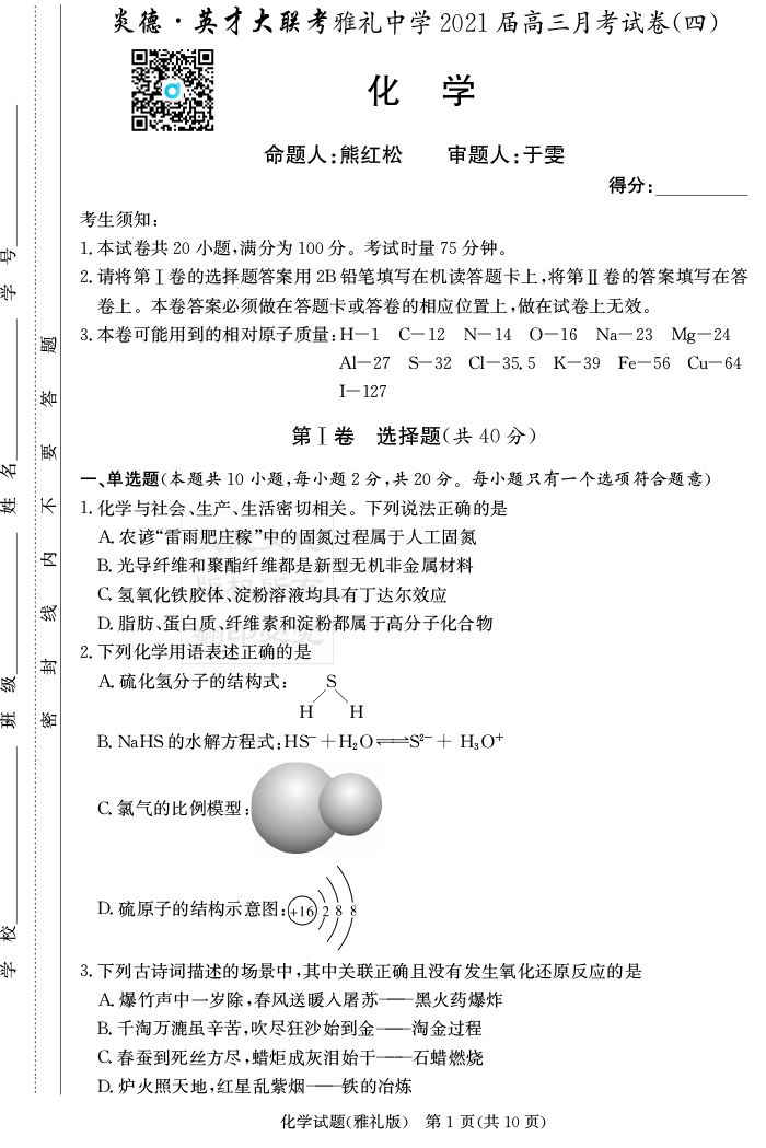 【化學】炎德英才大聯(lián)考2021屆雅禮中學高三4次月考