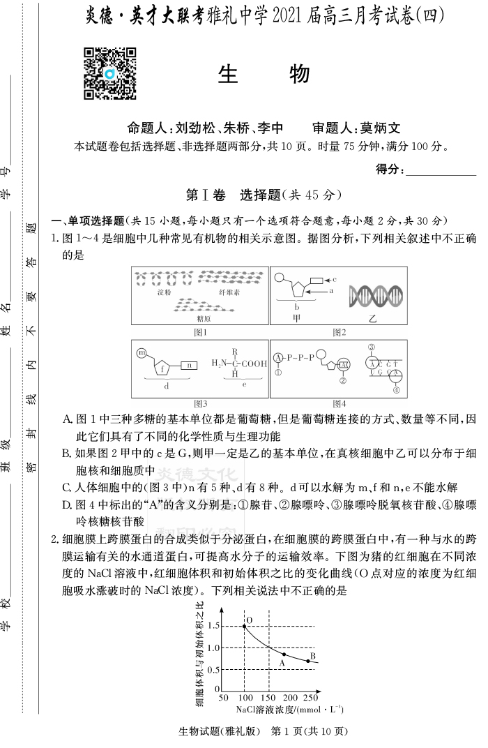 【生物】炎德英才大聯(lián)考2021屆雅禮中學(xué)高三4次月考