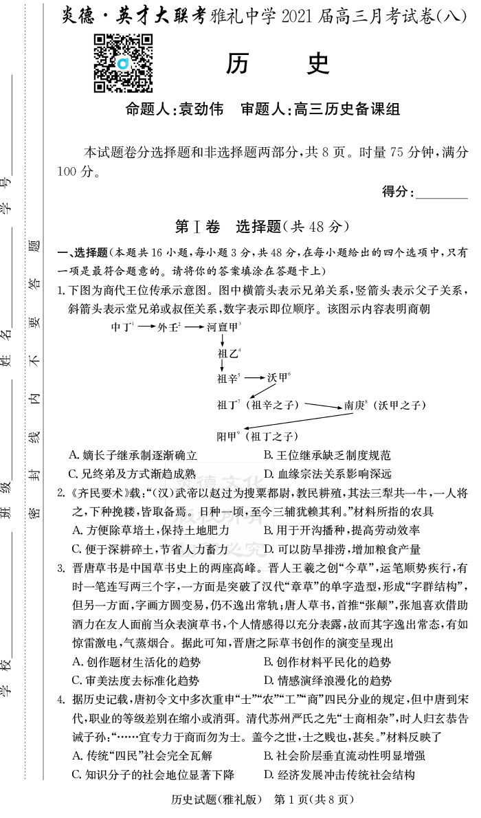【歷史】炎德英才大聯(lián)考2021屆雅禮中學(xué)高三8次月考