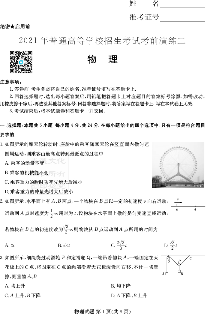 【物理】2021年普通高等學(xué)校招生全國統(tǒng)一考試考前演練(二)