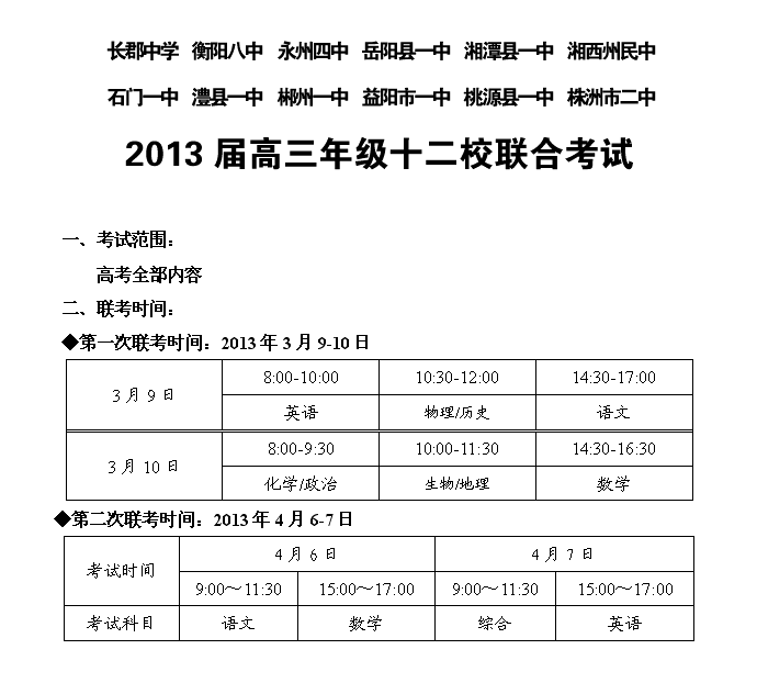 2013屆高三年級十二校聯(lián)合考試時間安排