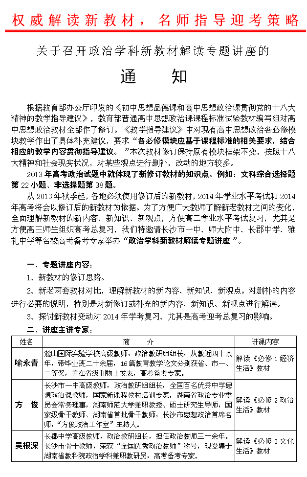 關于召開政治學科新教材解讀專題講座的通知(2013.09.08)