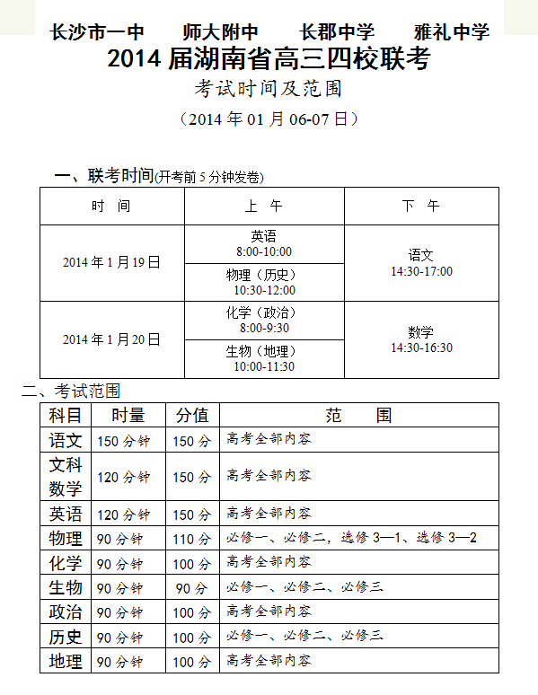 炎德英才大聯(lián)考2014屆湖南省高三四校聯(lián)考考試時間安排及范圍(2014.01.19-20)