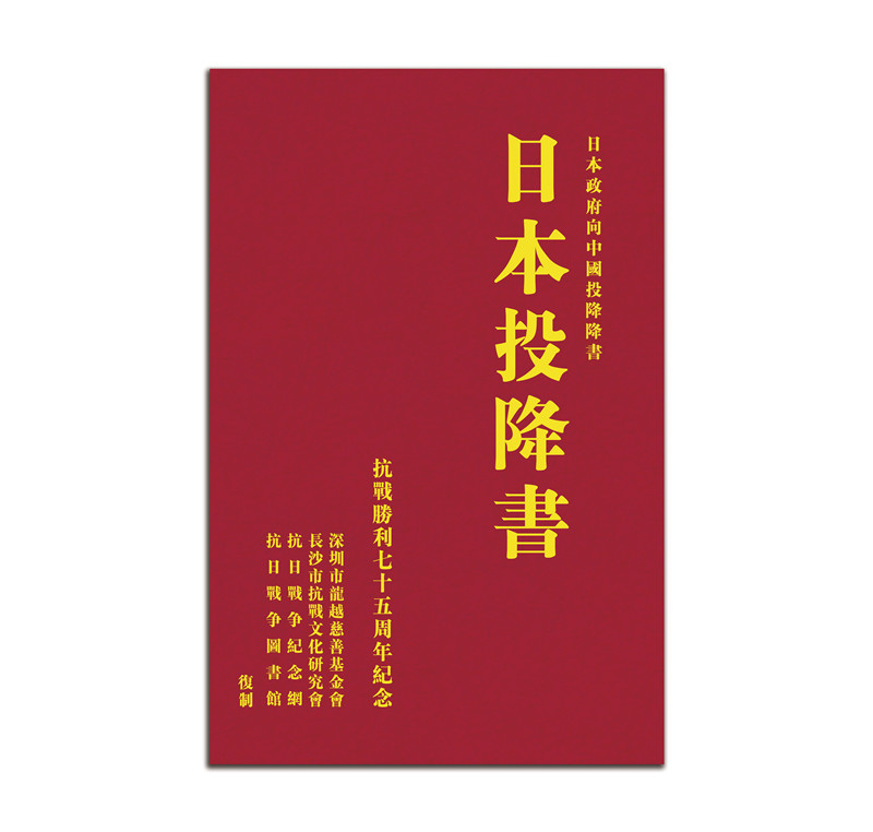 為慶祝日本投降75周年,深圳市龍越慈善基金會、抗日戰(zhàn)爭紀(jì)念網(wǎng)、長沙市抗戰(zhàn)文化研究會、抗日戰(zhàn)爭圖書館特別復(fù)制27375本(紀(jì)念抗戰(zhàn)勝利27375天)《日本投降書》,向關(guān)注抗戰(zhàn)歷史的國人免費(fèi)贈送(需支付快遞費(fèi))。