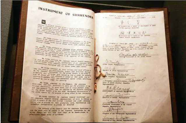 1945年8月15日,裕仁天皇向全國進(jìn)行廣播接受《波茨坦公告》并且頒布無條件投降詔書,宣布向盟國無條件投降。盟軍最高司令麥克亞瑟隨即率美、中、英、蘇、澳、加、法、荷、新等國的代表赴日本受降。簽字儀式于1945年9月2日上午九時在美國海軍“密蘇里”號戰(zhàn)列艦上舉行。中國代表徐永昌上將在商震將軍陪同下代表中國在投降書上簽字。