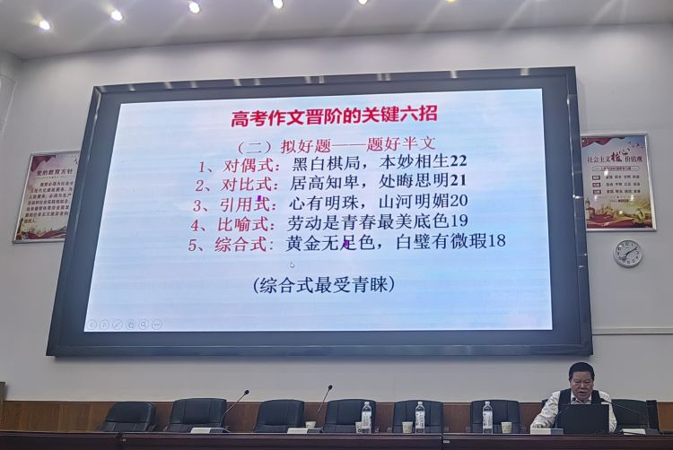 本次講座主題是高考作文提升的關(guān)鍵六招及備考策略,圍繞“審好題、擬好題、建好構(gòu)、用好例、寫深刻、語言優(yōu)”六個關(guān)鍵點(diǎn)展開。馬老師語言風(fēng)趣幽默、 舉止平易近人,講座內(nèi)容涉及知識面之廣,提供信息之前沿,傳遞消息之權(quán)威,可謂傾囊相助,盡顯其深厚的專業(yè)功底和高雅的文學(xué)涵養(yǎng)。