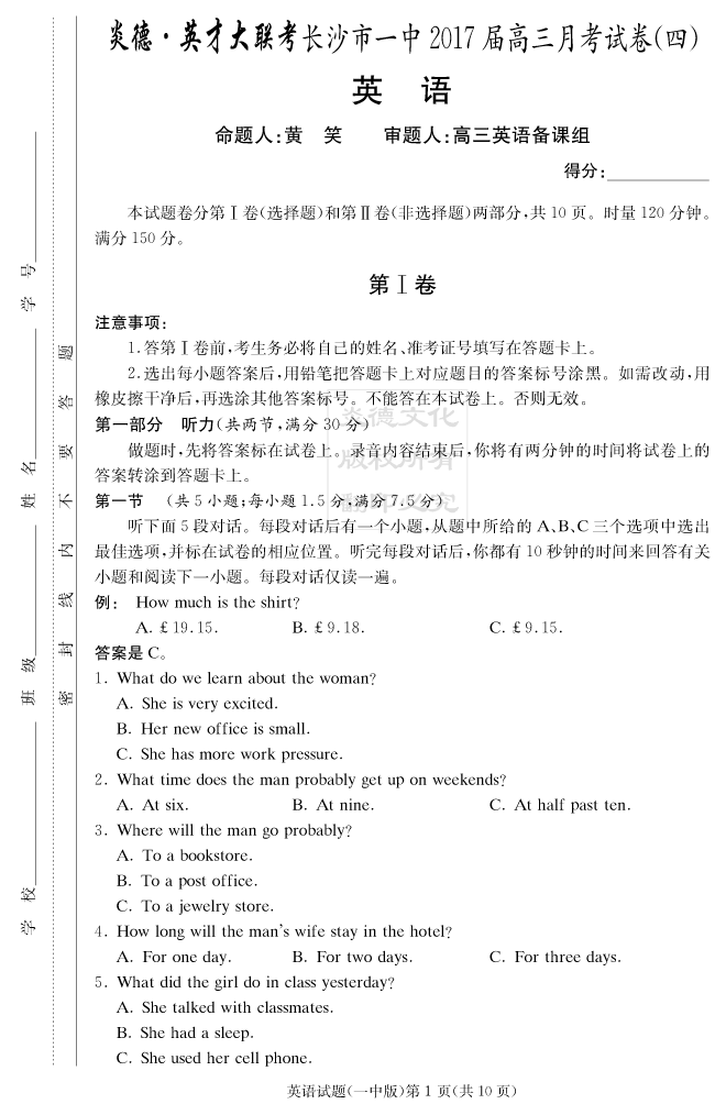 【英語】炎德英才大聯(lián)考2017長(zhǎng)沙一中高三4次月考