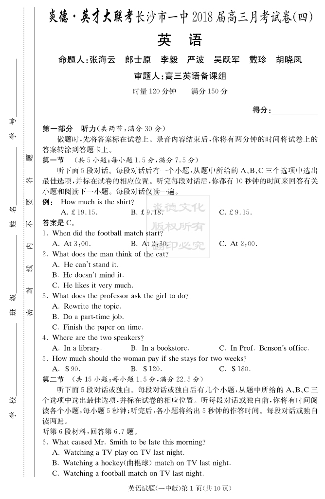【英語】炎德英才大聯(lián)考2018長沙一中高三4次月考